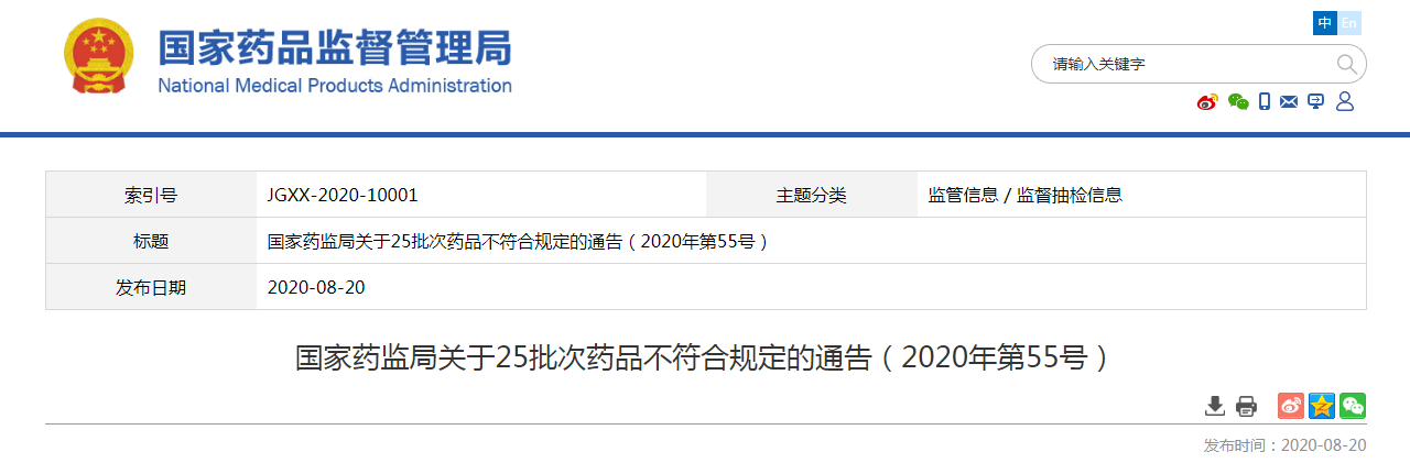 8月20日,国家药监局发布了关于25批次药品不符合规定的通告,有20家药品生产企业生产的25批次药品不符合规定。