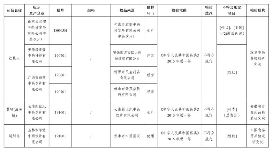 经深圳市药品检验研究院检验,标示为祁东县君儒中药材发展有限公司中药饮片厂、安徽济善堂中药科技有限公司、广西福益堂中药饮片有限公司生产的4批次红景天不符合规定,不符合规定项目包括性状、鉴别。