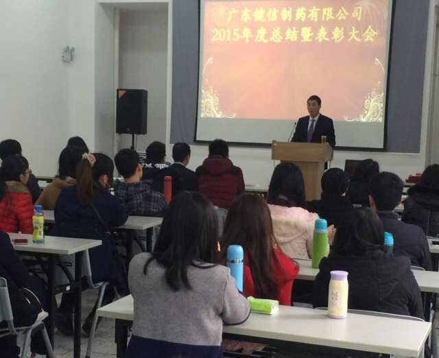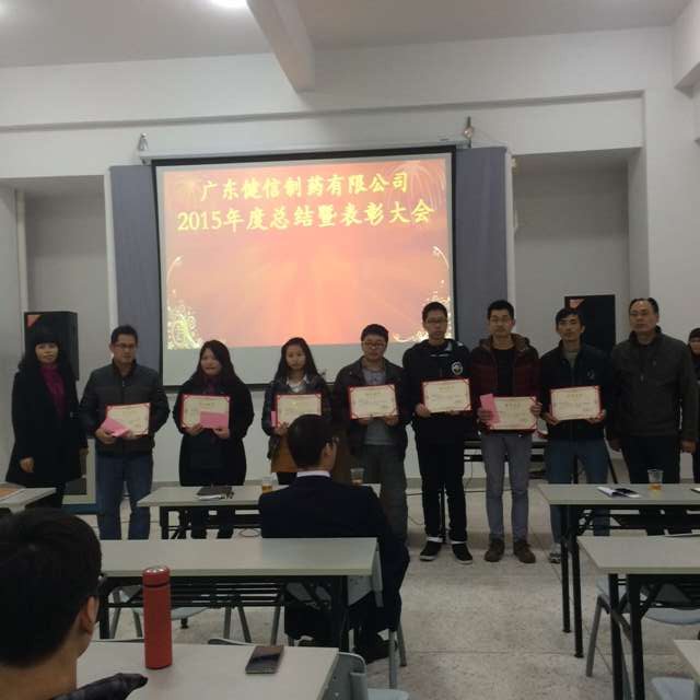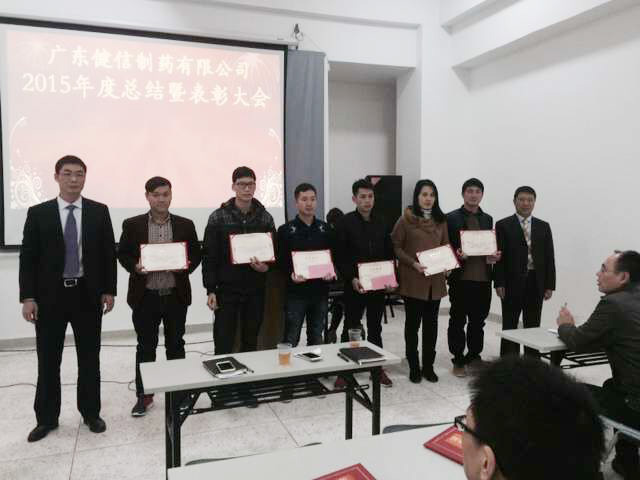 健信制药和健信药品于2016年2月14日,举行2015年度表彰总结大会。会上,总经理黄邦信、副总经理黄国胜、副总经理郑宏洪、业务经理李国、营销中心经理黄邦彭、表彰代表人黄丽娜、质量总监刘佩洁先后汇报了2015年度的工作业绩成果,并对全体员工一年来的付出与努力表示了衷心的感谢!